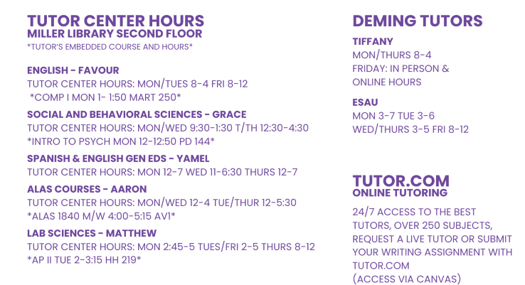 Located in Miller Library 2nd floor, the Tutor Center offers free, accessible, and convenient options to supplement your academic experience. We offer In-Person Peer-to-peer tutoring services on main campus, providing personalized attention on campus to help you with your courses in one-on-one sessions, group sessions, embedded in-class tutors, and workshops for general education courses. If you need assistance in core classes, connect with your academic department for additional resources.
